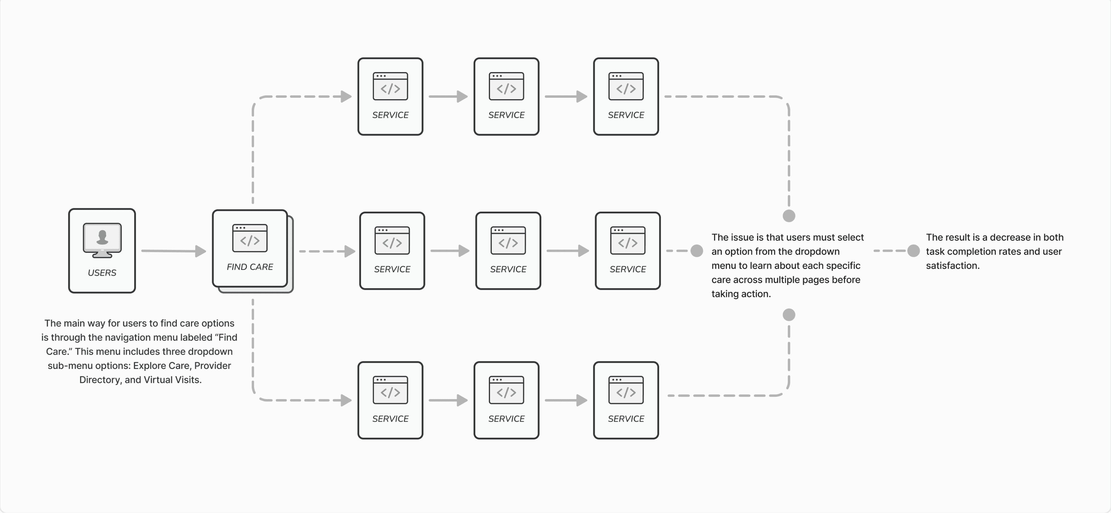 The "Find Care' page was missing, so users had to rely on the main navigation bar to discover care options. However, when they did find the "Find Care' menu, they were underwhelmed by three options without context and did not clearly explain what each category included.