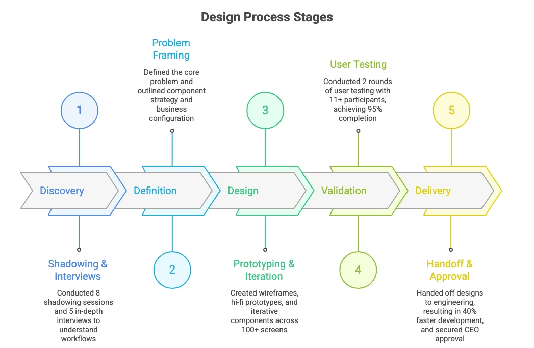 Led the UX team through a redesign of a fragmented internal insurance application used across the company. Standardized workflows and reusable components reduced design-to-development handoff time by 40%, achieved 90%+ usability satisfaction, and secured Phase 2 funding from executive leadership.